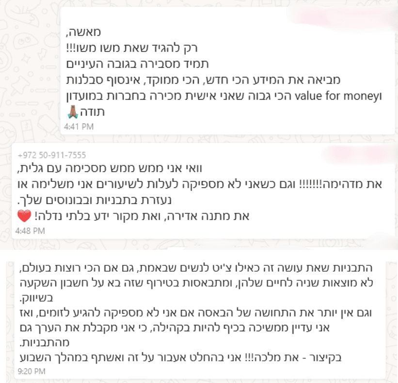 "השירות? מעולה! התוכן? חד, מדויק והכי חשוב - ישים!!! ואני? ממליצה בלב שלם"