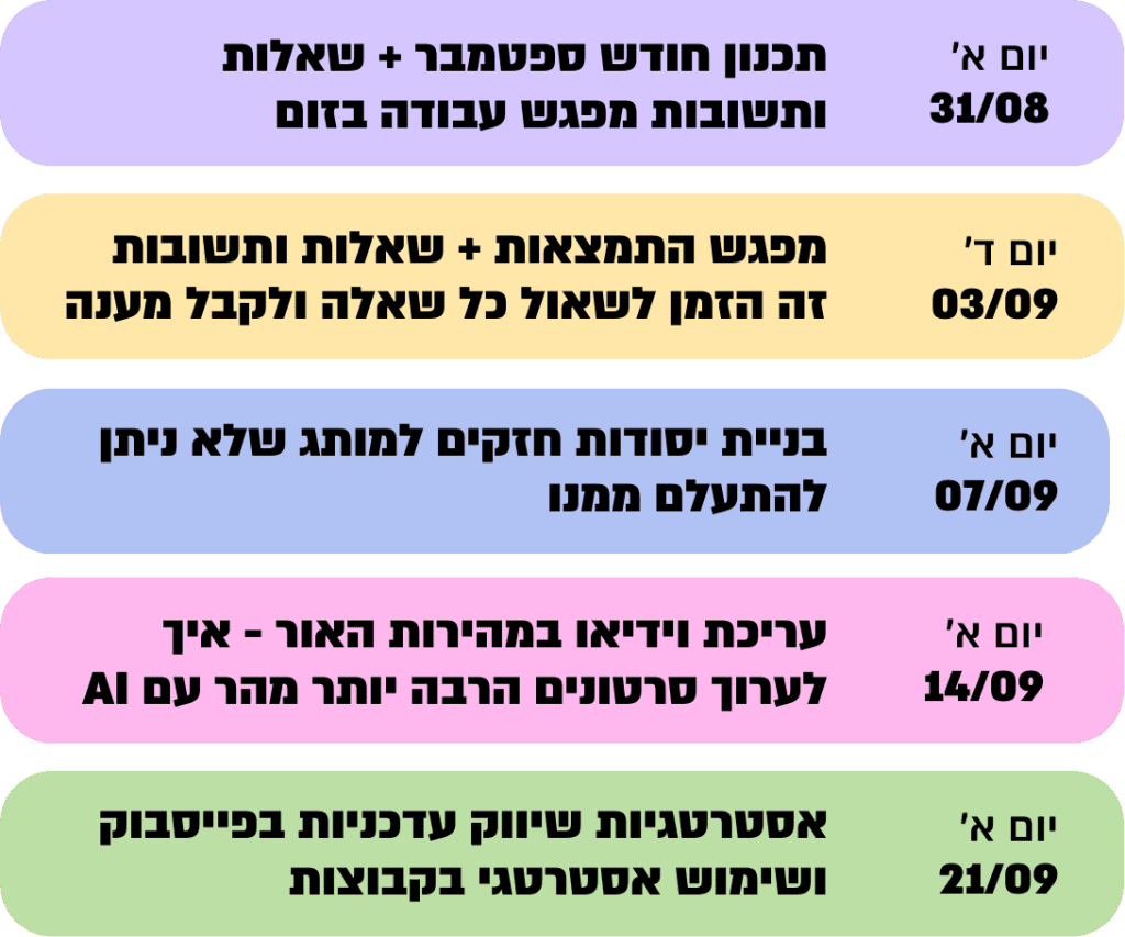 אני יודעת שחשוב לך להיות בכל המפגשים ולא לפספס דבר. לכן הכנתי לך לו"ז מסודר לחודש הקרוב.