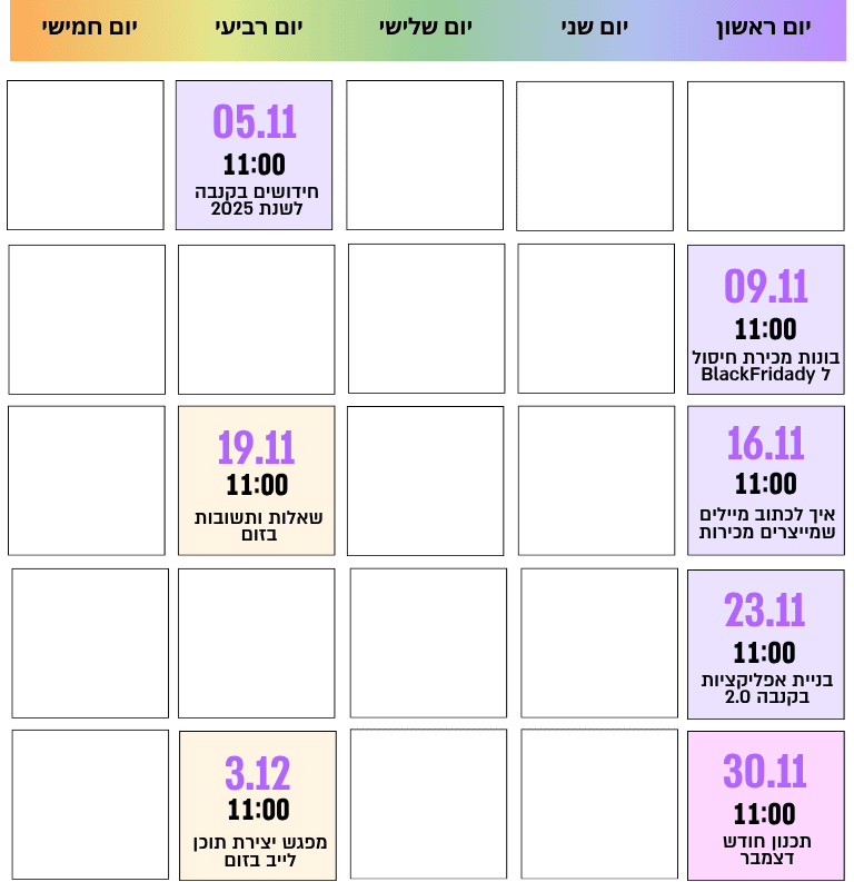 אני יודעת שחשוב לך להיות בכל המפגשים ולא לפספס דבר. לכן הכנתי לך לו"ז מסודר לחודש הקרוב.